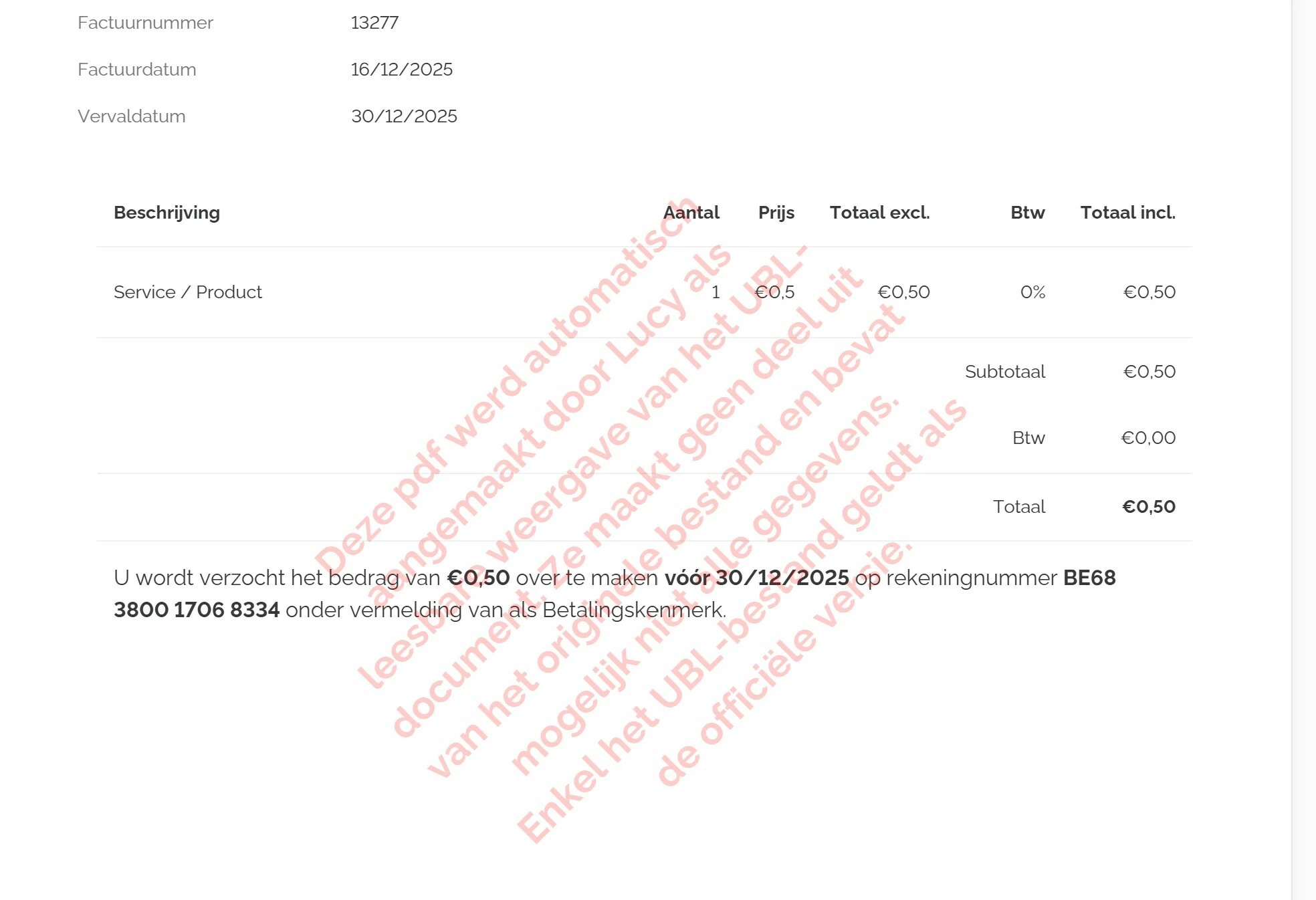 However, I do have a question. We sent a test invoice to ourselves, and the result wasn't as expected. The PDF generated is not readable, and our system indicates that it had to create a PDF itself, stating that only the official UBL is valid. Could you please advise on how to proceed with this issue?