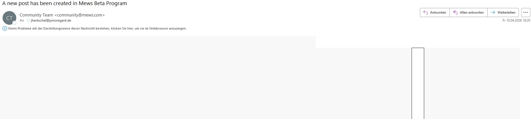 ich hatte mich vor einiger Zeit schon an Mews gewandt, da seit gut zwei Monaten die Benachrichtigung-Mails von Mews bzgl. neuen Topics in Community bei mir nicht mehr angezeigt werden.