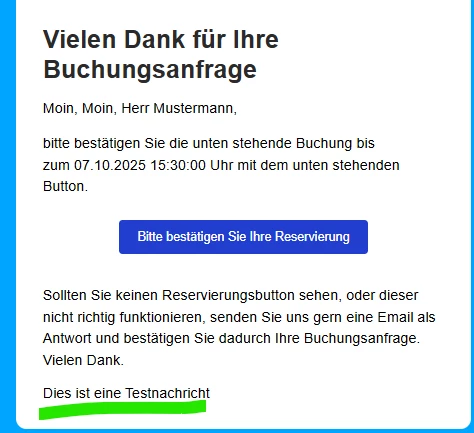 Ich habe eine bestehende TestReservation mir wieder zugesendet, aber vom TEST Text steht nichts in der neuen e-mail