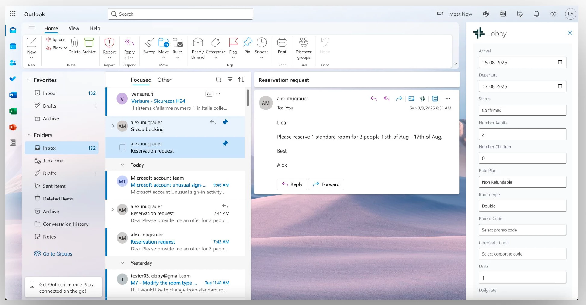 Im Grunde wird Lobbyai in das Outlook vom Hotel integriert und kann teilautomatisch bzw. vollautomatisch auf Anfragen antworten. Egal ob es um die Frühstückszeiten, die Preise für Haustiere, Unternehmungen in der Region geht oder eben um echte Reservierungsanfragen oder Stornierungen.