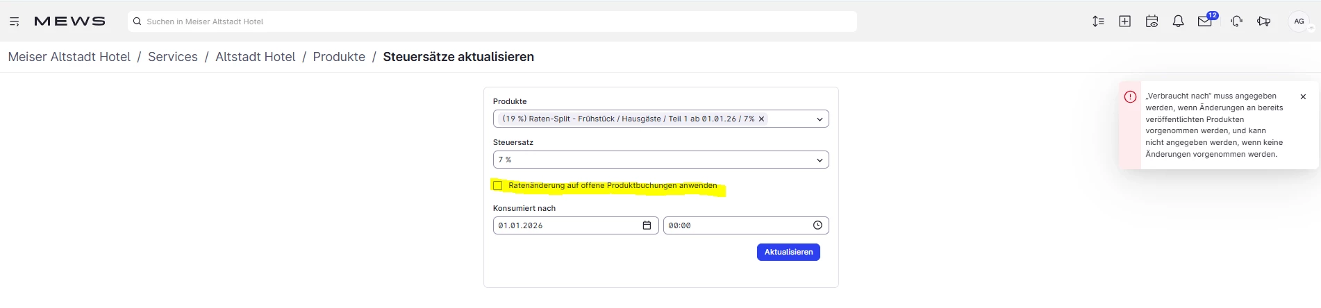 Was die Umstellung der Mehrwertsteuer für Lebensmittel am 1. Januar betrifft, so kann Mews diese nicht automatisch am 1. Januar migrieren, da es sich nicht um eine vollständige Aktualisierung der Mehrwertsteuerklasse handelt (nicht alles, was derzeit mit 19 % besteuert wird, muss auf 7 % umgestellt werden). Daher können nur die Hoteliers wissen, welche ihrer Produkte aktualisiert werden müssen, und sollten zu diesem Zweck das in Ihrer Frage oben erwähnte Tool zur Steueraktualisierung verwenden.