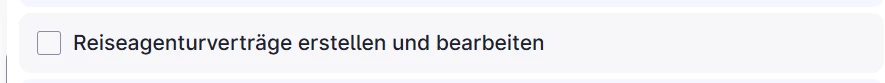 Die Berechtigung die deine Mitarbeiter benötigen um den Reiter “Vertragsverwaltung” sehen zu können ist “Reiseagenturverträge erstellen und bearbeiten”: