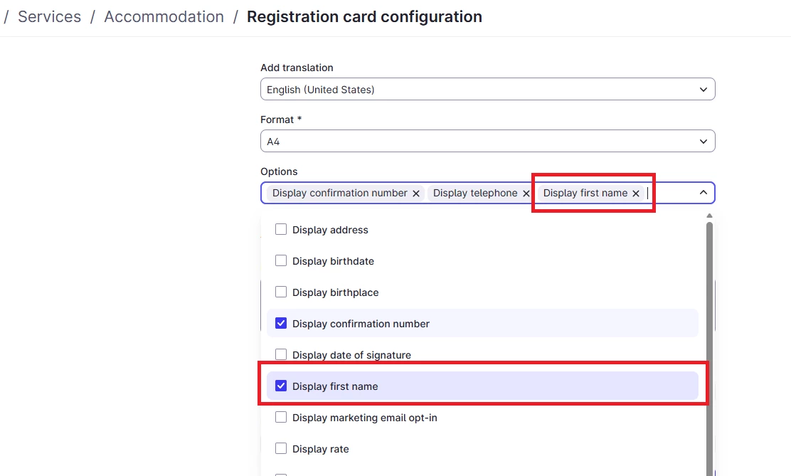 Unser Tech Team hat jetzt, um das Problem mit dem fehlenden Vornamen auf den gedruckten Meldescheinen zu lösen, einen Fix implementiert. Ihr habt die Möglichkeit in der Meldescheinkonfiguration den Vornamen hinzuzufügen: