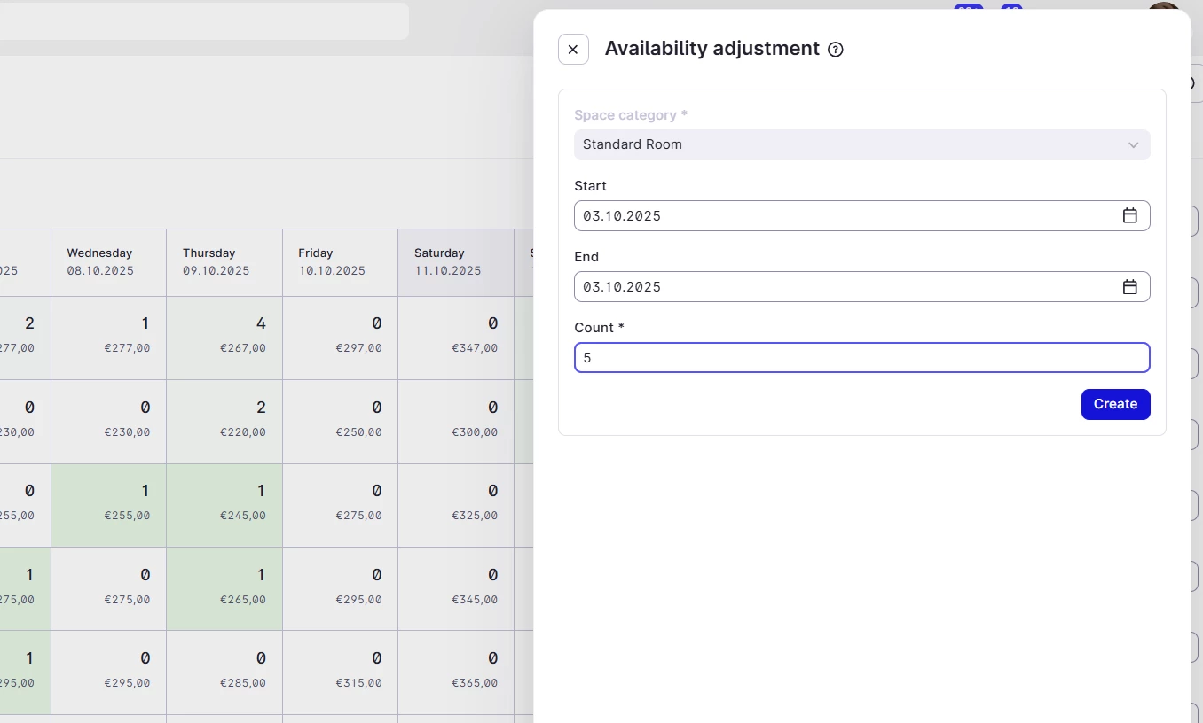 Then select Adjustments and write a number that should adjust your inventory, it works in plus or minus, so the same way you can add the inventory to overbook the spaces, you can also put minus number to block the sale for some amount of rooms within that category.
