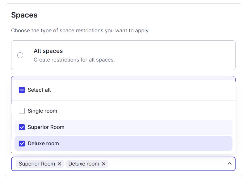 If I want to block out dates for certain room types, I need to create a restriction for each space category separately which is time consuming plus confusing as at some point you might delete a restriction and as there are so many, mistakes could be made