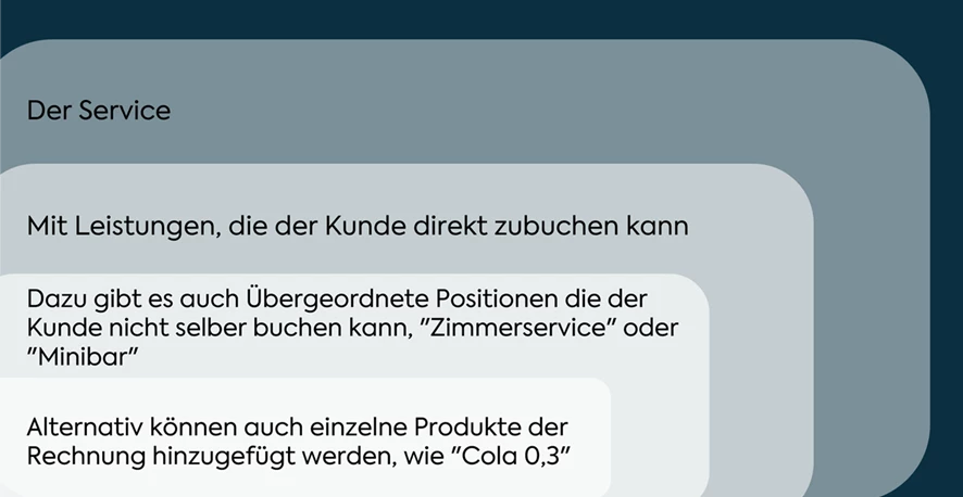 Dieser Service hat verschiedene Produkte, die exklusiv dafür verfügbar sind. Auf Seiten MEWS geht die Logik dahin, dass es Produkte und Artikel zu geben hat die der Gast selber über die MEWS Buchungsplattform buchen kann und Produkte, die nur der Mitarbeiter hinzufügen sollte. Die letzteren können auch als Einzelartikel gebucht werden.