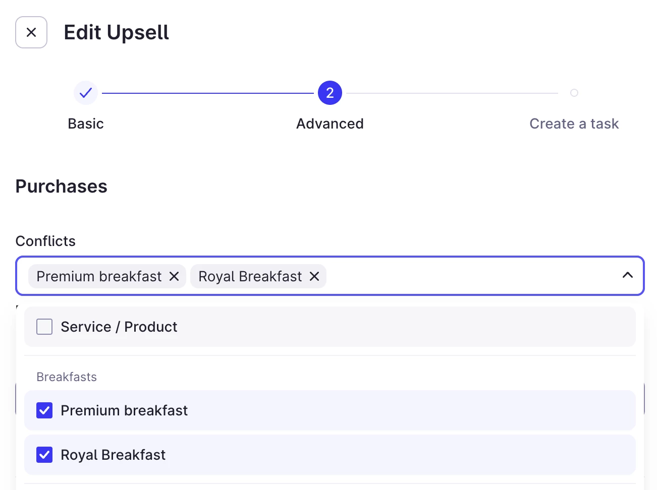 Set up conflict rules to prevent offering duplicate products. For instance different types of breakfasts like below, so you can specify which products will not be shown together.