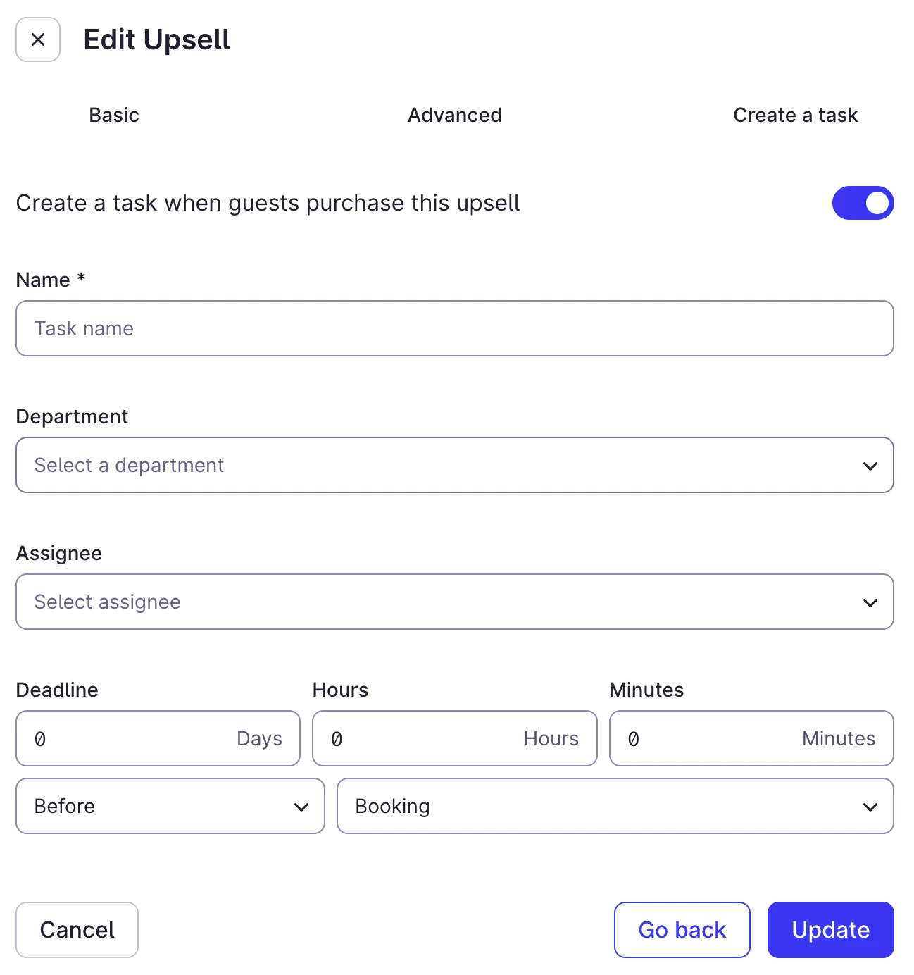 Automatically create tasks for your team when guests purchase specific products through different touch points, ensuring nothing falls through the cracks. Now each item will have it’s own task and you can specify exactly the when and the who of each task.