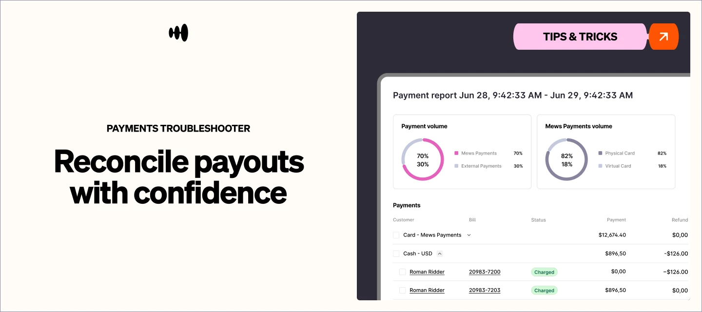 For Adyen-based payouts, follow the “match payout to Payment report and Mews payments balance” how-to if you need a step-by-step with Settlement IDs and date ranges.