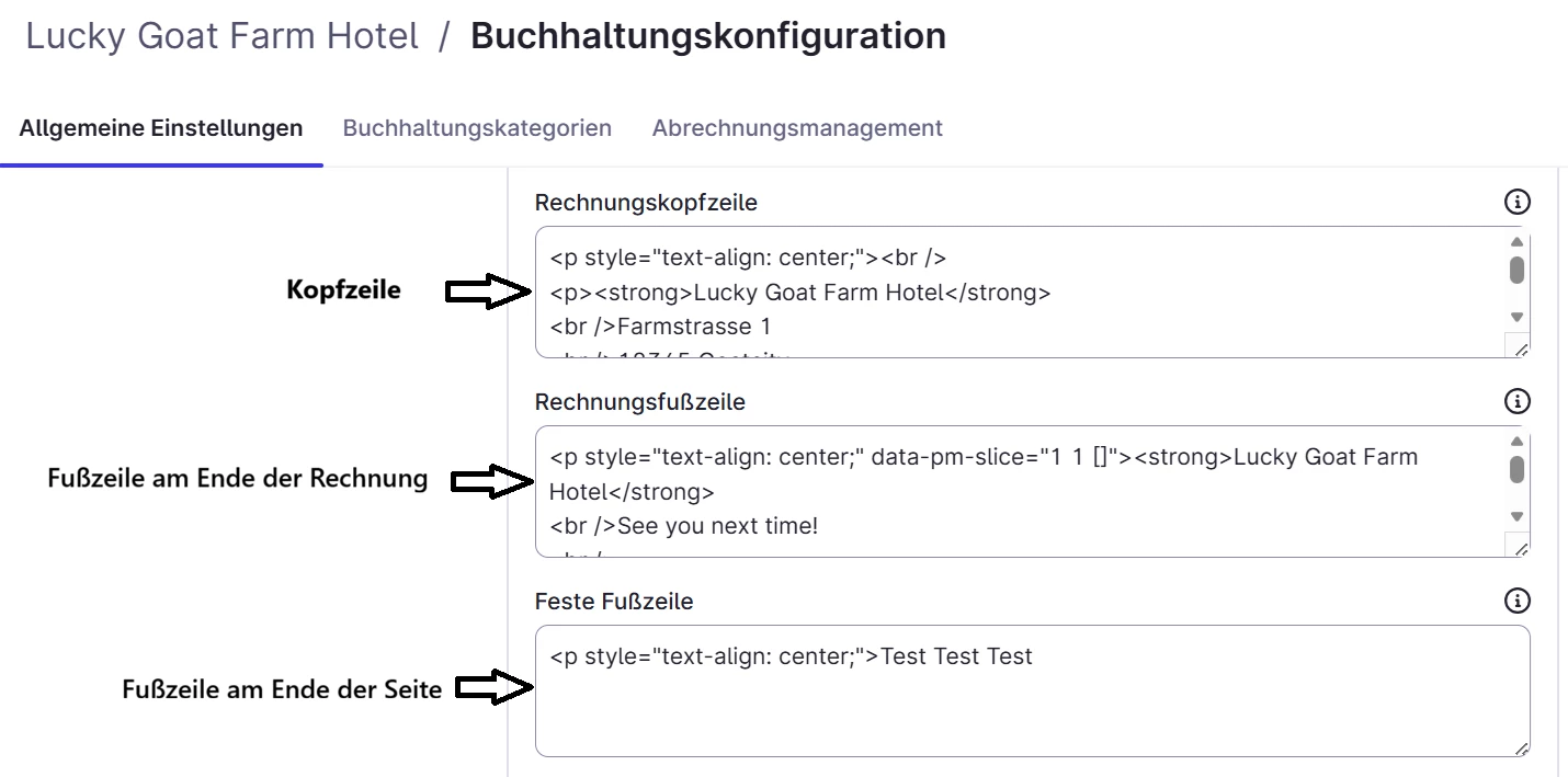 Es gibt in den Rechnungen zwei verschiedene Fußzeilen. Einmal die Rechnungsfußzeile die direkt unter dem Saldo angezeigt wird und einmal die feste Fußzeile die am Ende jeder Seite sichtbar ist. Die Position der Fußzeilen auf der Rechnung kann nicht geändert werden. Du kannst den Text jedoch zentrieren indem du den Code <p style="text-align: center;"> davor setzt.
