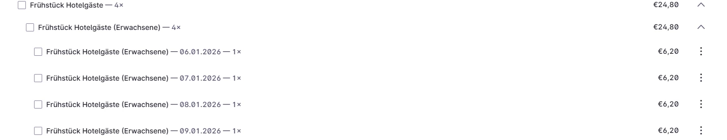 For bookable services (stays), nights and daily products like breakfast are created as separate order items per day/per person. That means you already see one item per night / per breakfast, so you can easily move a single night or breakfast to a different guest or company.