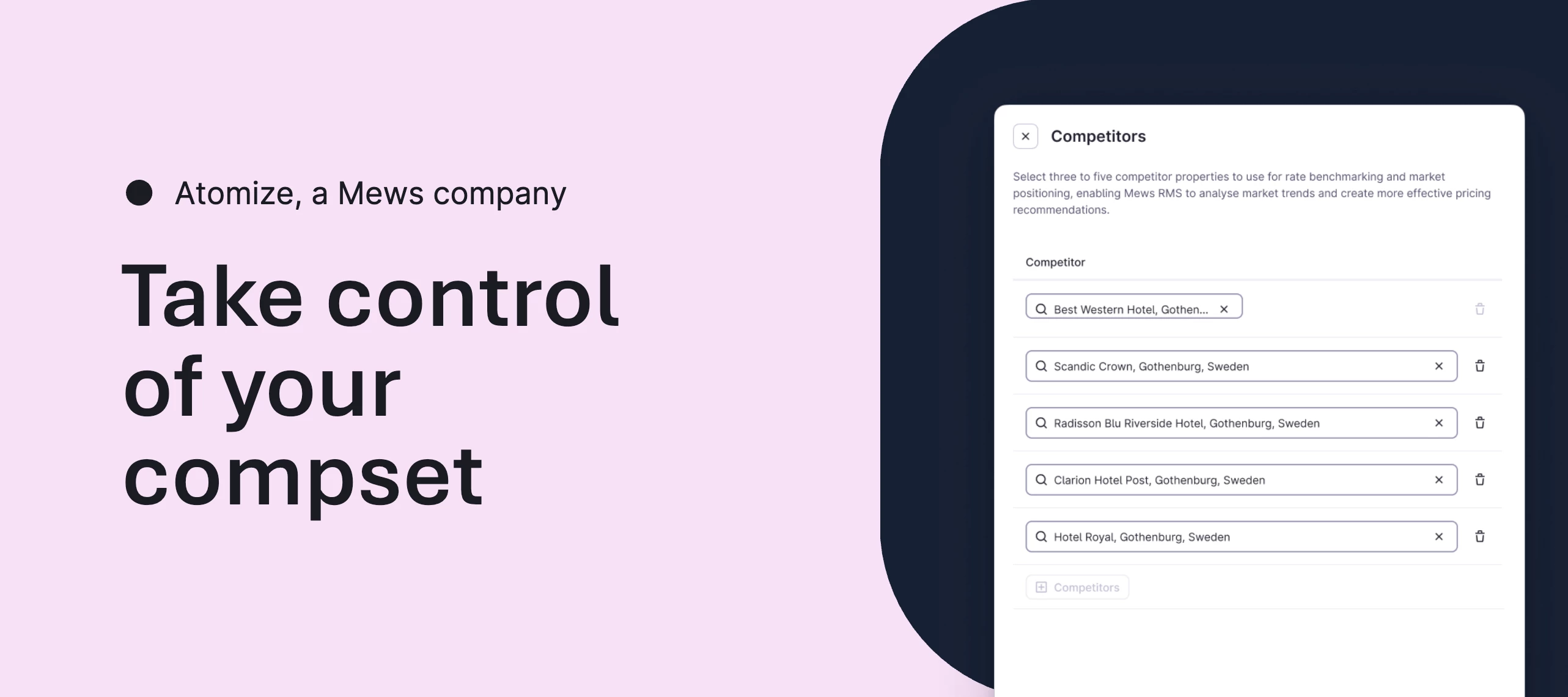 We’re introducing a new update that puts you in charge of who appears in your compset in Atomize, a Mews company. This helps you keep your competitive view accurate, relevant and aligned with your pricing strategy as your market and positioning evolve.