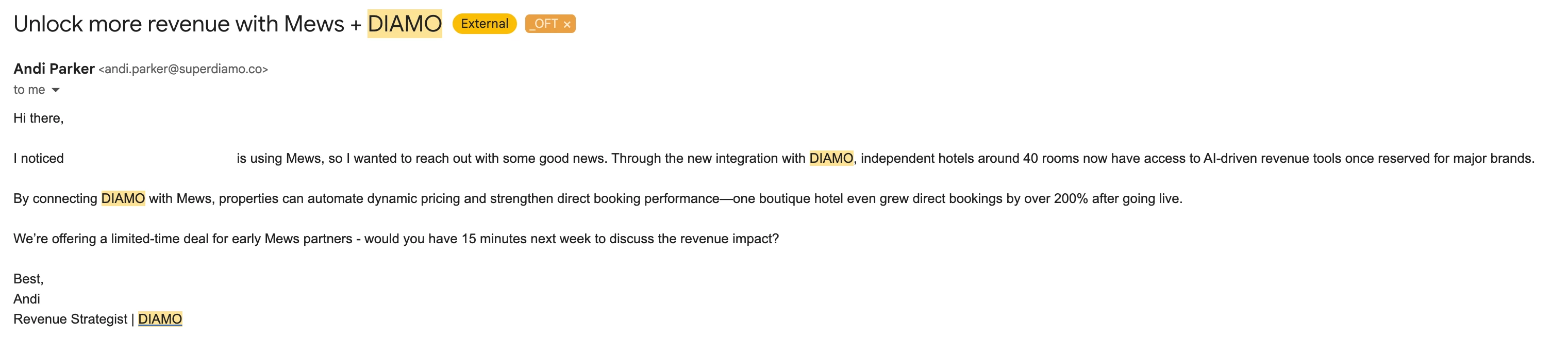 Anyone else getting non-stop e-mails from “Diamo”, a revenue management solution? We’ve had dozens emails from these guys so far, and they mention specifically that they work with Mews.
